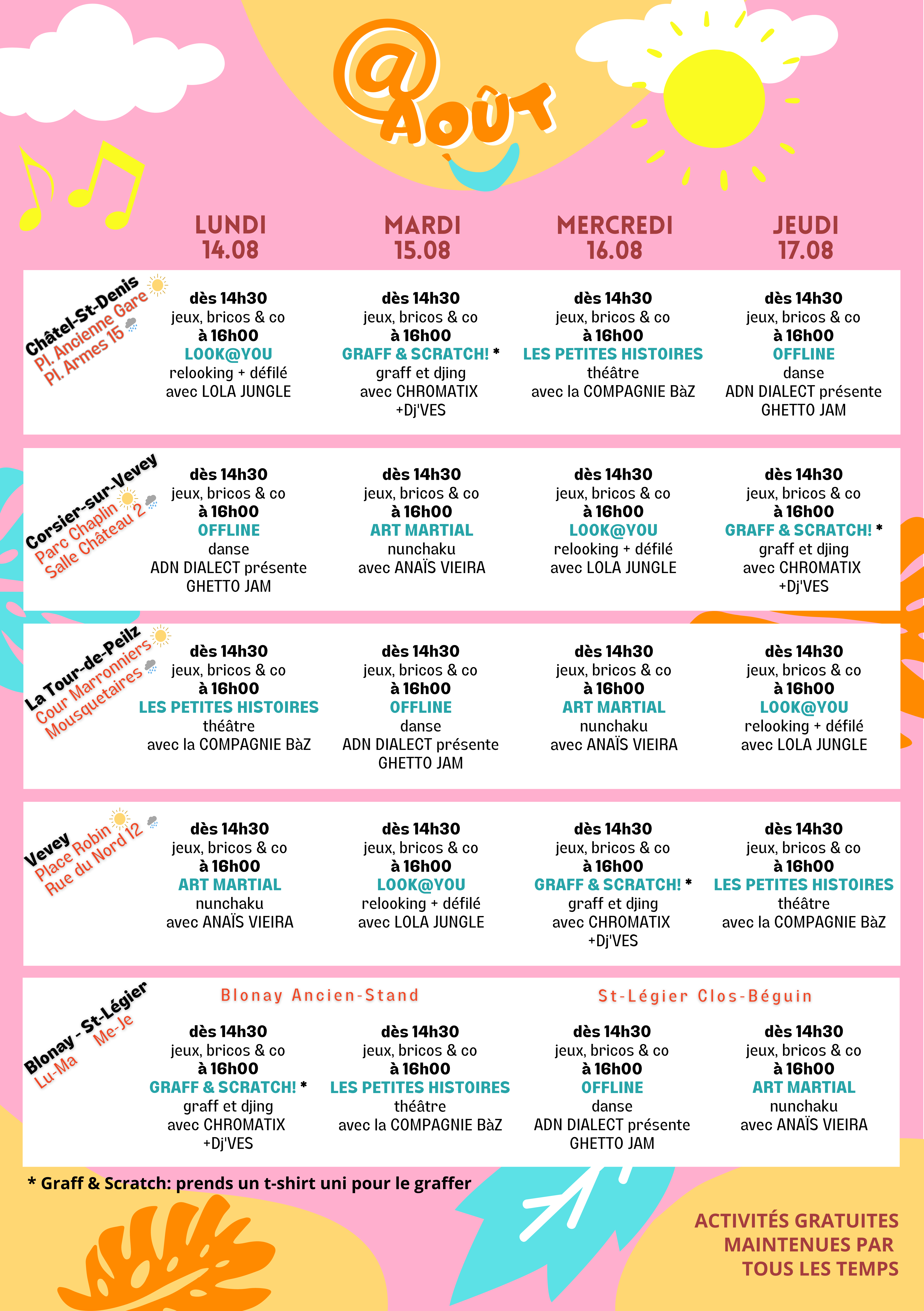 Dédié aux enfants et à leur famille, le projet régional d’animation socioculturelle @août revient à la Tour-de-Peilz, Vevey, Corsier-sur-Vevey, Blonay-Saint Légier et Châtel-St-Denis du 14 au 17 août 2023.